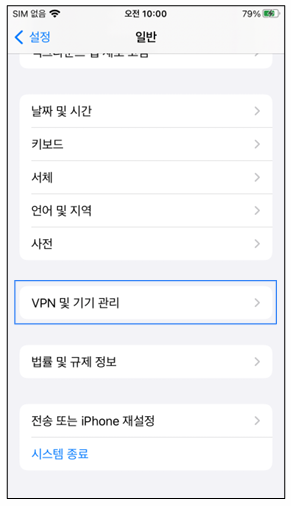 3.2 iOS 앱 설치 시 일반설정 > VPN 및 기기 관리 선택 > 설치한 그룹웨어 모바일 앱을 선택 > 앱을 신뢰함 선택합니다. - 모바일 OTP 신청